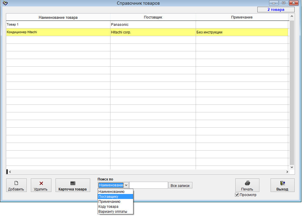 Для поиска товара в справочнике выберите параметр поиска и введите текст для поиска в поле Поиск.
