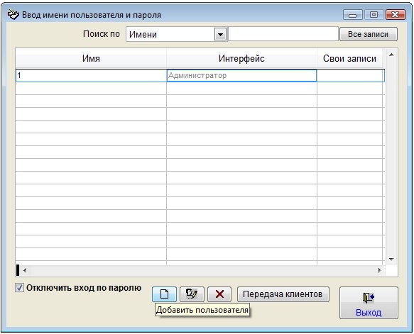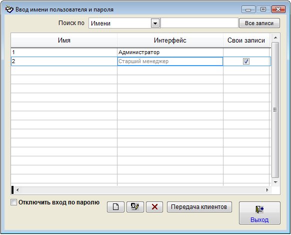 При отключенной галочке "Отключить вход по паролю" при входе в программу станет появляться окно контроля доступа пользователей.