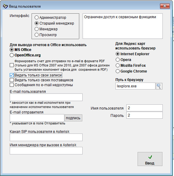 При входе в программу пользователь будет иметь те права доступа, которые были заданы при создании/изменении профиля данного пользователя.