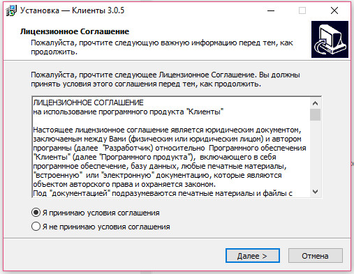 При запуске установочного дистрибутива на установку (DblClk на скачанный архив) запустится окно инсталлятора и появится лицензионное соглашение.