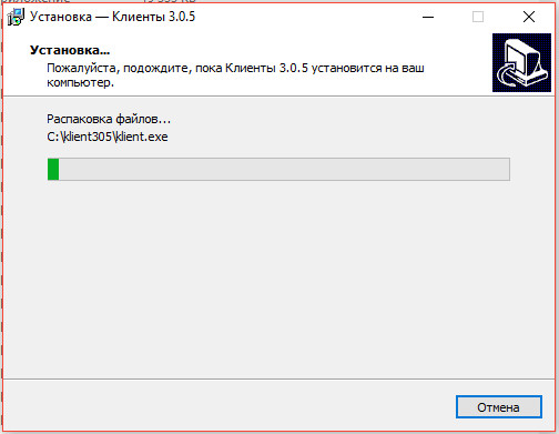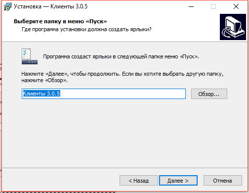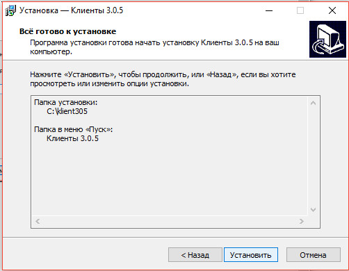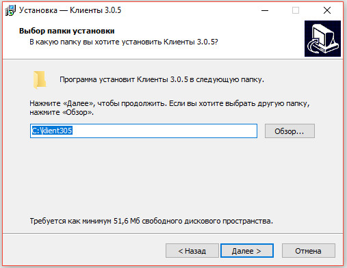 Укажите в текстовой строке папку для инсталляции программы (например C:\klient305 ) либо выберите ранее созданную через дерево каталогов. По умолчанию для каждой новой версии программы папка своя.