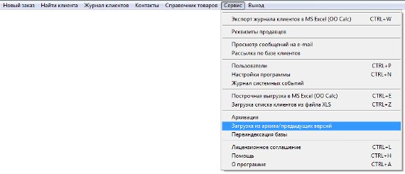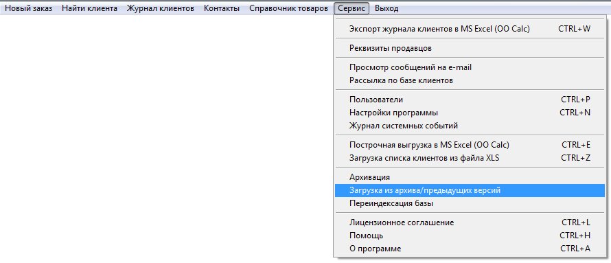 Для восстановления информации из архива в программе "Клиенты" выберите раздел меню Сервис-Загрузка из архива / предыдущих версий
