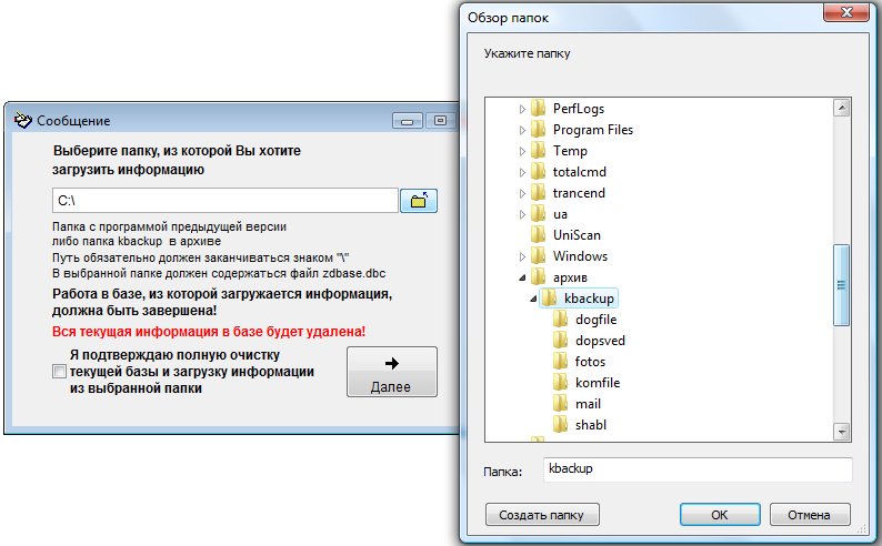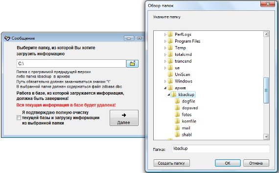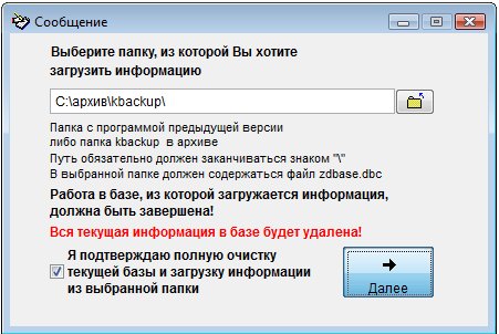 В открывшемся окне нажмите на кнопку с желтой папкой и выберите папку, из которой требуется загрузить информацию, например C:\архив\kbackup
