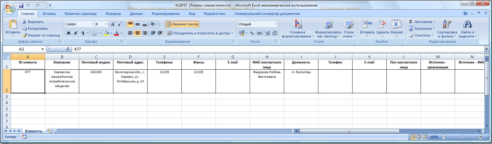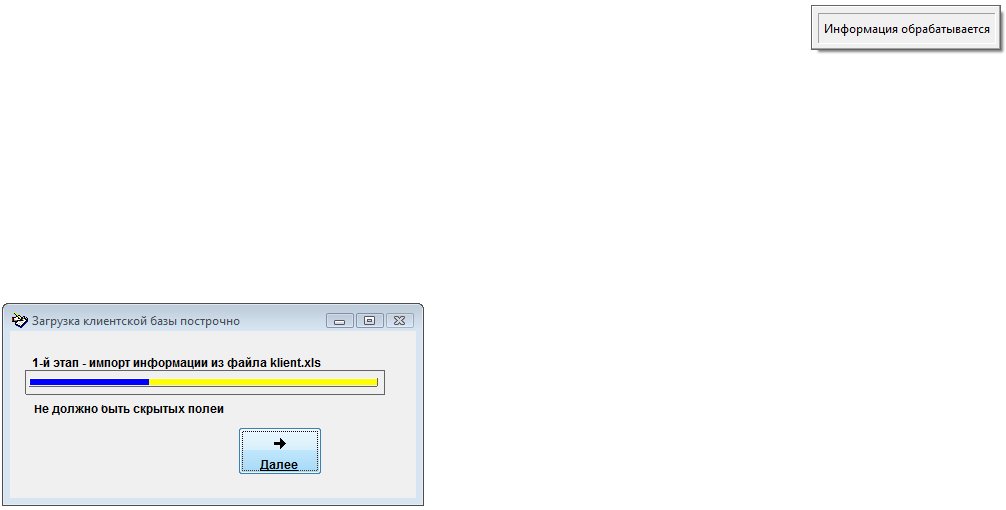 Информация загружается из файла KLIENT.XLS, находящегося в папке с программой, его перед загрузкой надо открыть в Excel, заполнить по столбцам с помощью копирования/вставки из Вашего файла, столбец "Компания" должен быть заполнен, по нему производится проверка на уникальность (шапку не удалять, порядок столбцов не менять!), после чего сохранить в формате Excel 5.0/95 (данный тип файла можно выбрать в любой версии Excel).