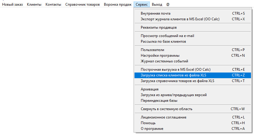 Затем запустите программу и выберите пункт меню "Сервис-Загрузка списка клиентов их файла XLS".