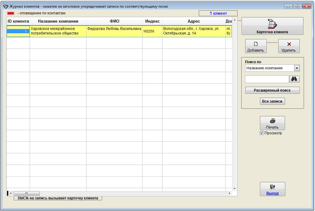 Загруженные из файла XLS клиенты (в нашем случае 1 клиент) отобразятся в журнале клиентов.