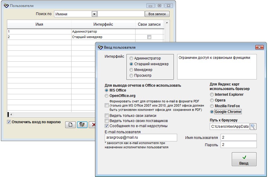 Если в программе включен вход по паролю, то браузер настраивается для каждого пользователя в профиле пользователя.