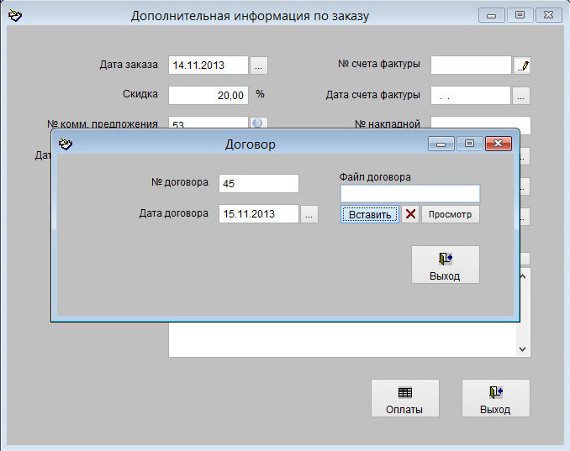 для прикрепления файла договора нажмите на кнопку с изображением увеличительносго стекла рядом с полем "№ договора" (его в дальнейшем можно отправить клиенту на e-mail вместе со счетом, установив соответствующую галочку в сообщении).