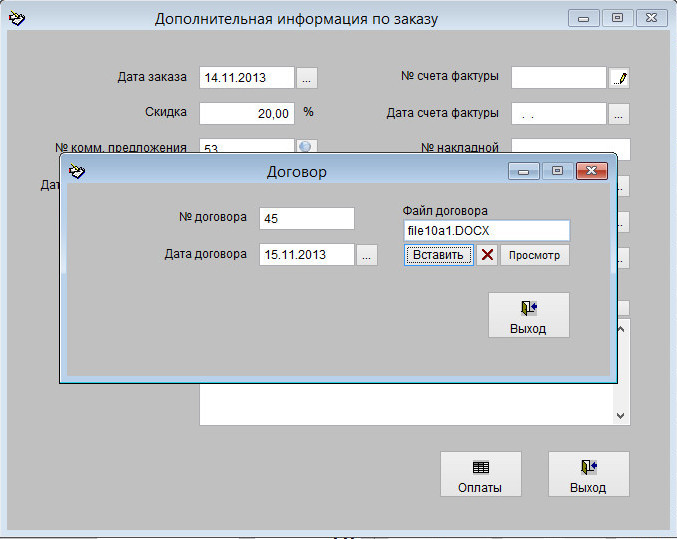 Для прикрепления файла договора нажмите кнопку "Вставить".
