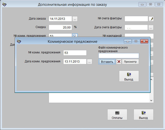 для прикрепления файла коммерческого предложения нажмите на кнопку с изображением увеличительносго стекла рядом с полем "№ комм. предложения" (его в дальнейшем можно отправить клиенту на e-mail вместе со счетом, установив соответствующую галочку в сообщении).