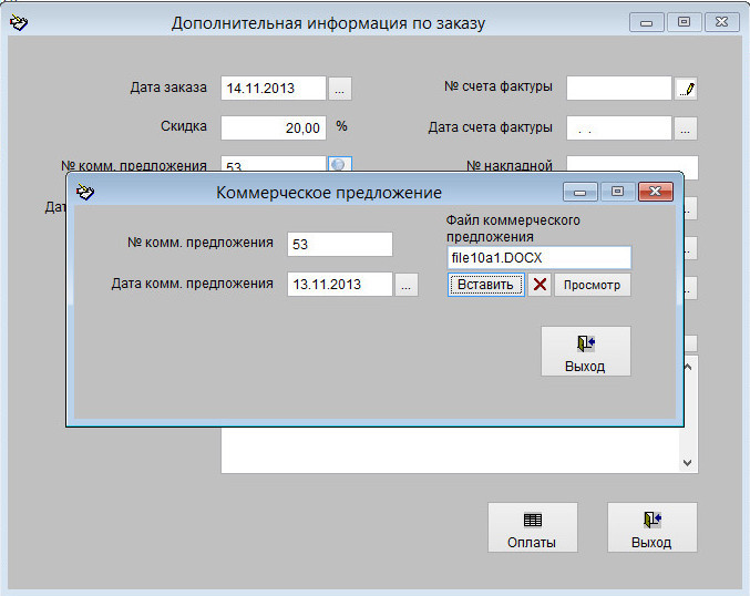 Для прикрепления файла коммерческого предложения нажмите кнопку "Вставить".
