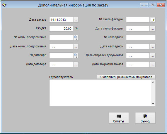 Для внесения дополнительной информации по заказу в форме заказа нажмите кнопку "Дополнительная информация по заказу".