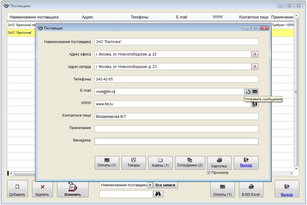 Для отправки уведомления по e-mail поставщику, либо кому либо из сотрудников поставщика надо открыть соответствующий раздел - карточку поставщика либо раздел "Сотрудники" в карточке поставщика.