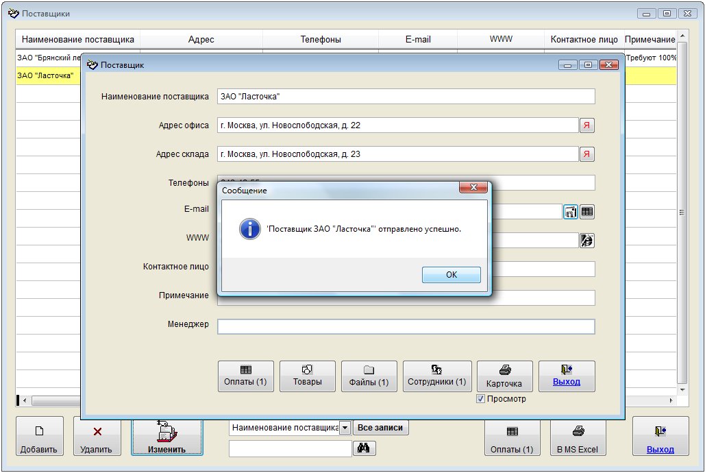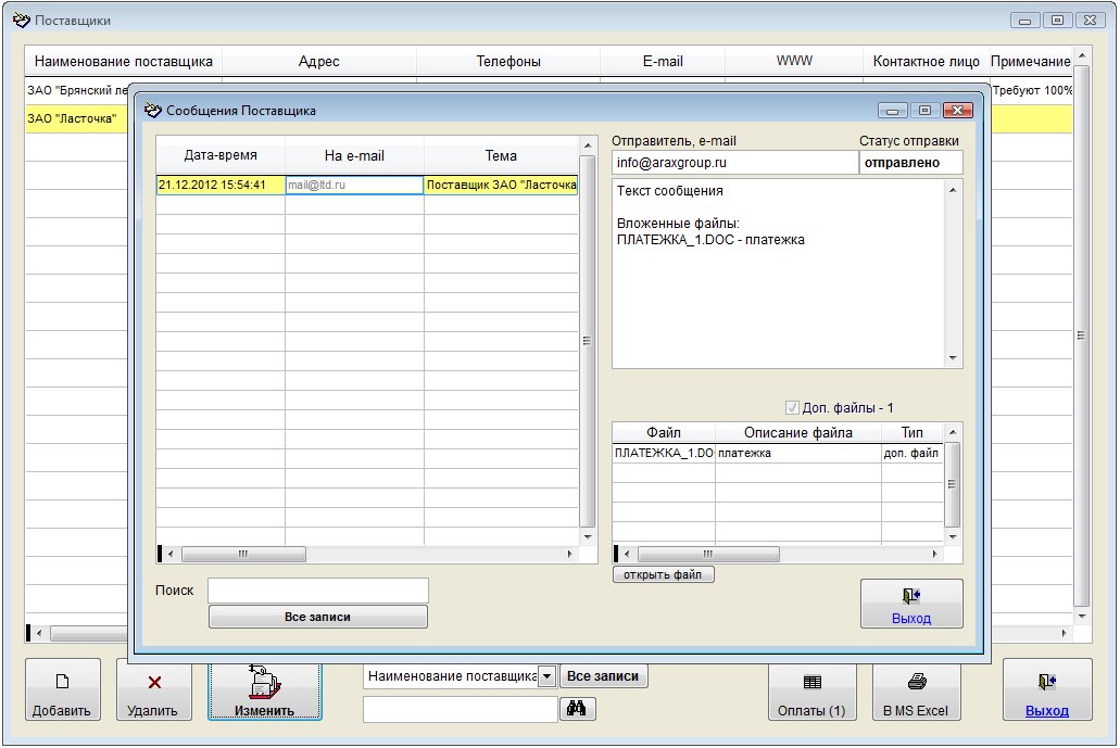 Откроются сообщения, отправленные из программы данному лицу в связи с данным поставщиком.