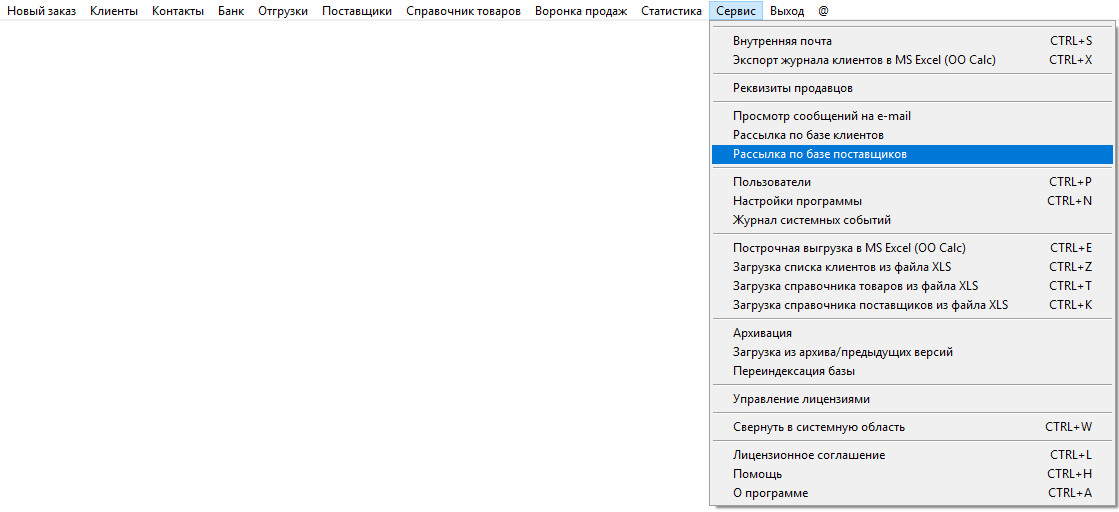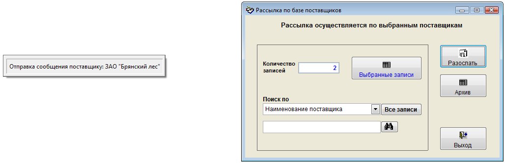 Для отправки осуществления рассылки по поставщикам откройте пункт меню "Сервис-Рассылка по базе поставщиков".