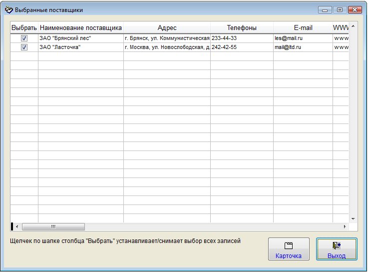 Щелчек мышкой по шапке столбца "Выбрать" устанавливает/снимает выбор всех поставщиков.