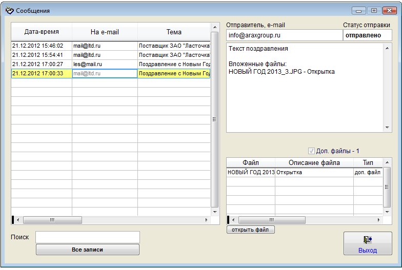 В архиве сообщений можно осуществлять поиск, видеть реквизиты сообщений и статус отправки, имеется возможность просмотра файлов вложений. Для этого выберите нужный файл и нажмите кнопку "открыть файл"