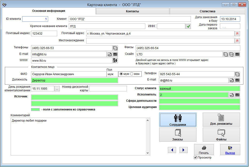 Для введения информации о сотрудниках клиента в карточке клиента нажмите кнопку "Сотрудники".