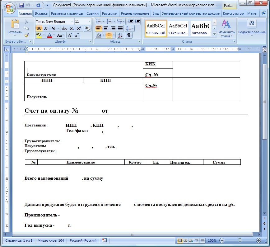 Формирование счета в формате PDF возможно, только если выбран для работы пакет MS Office версий 2007 и выше.