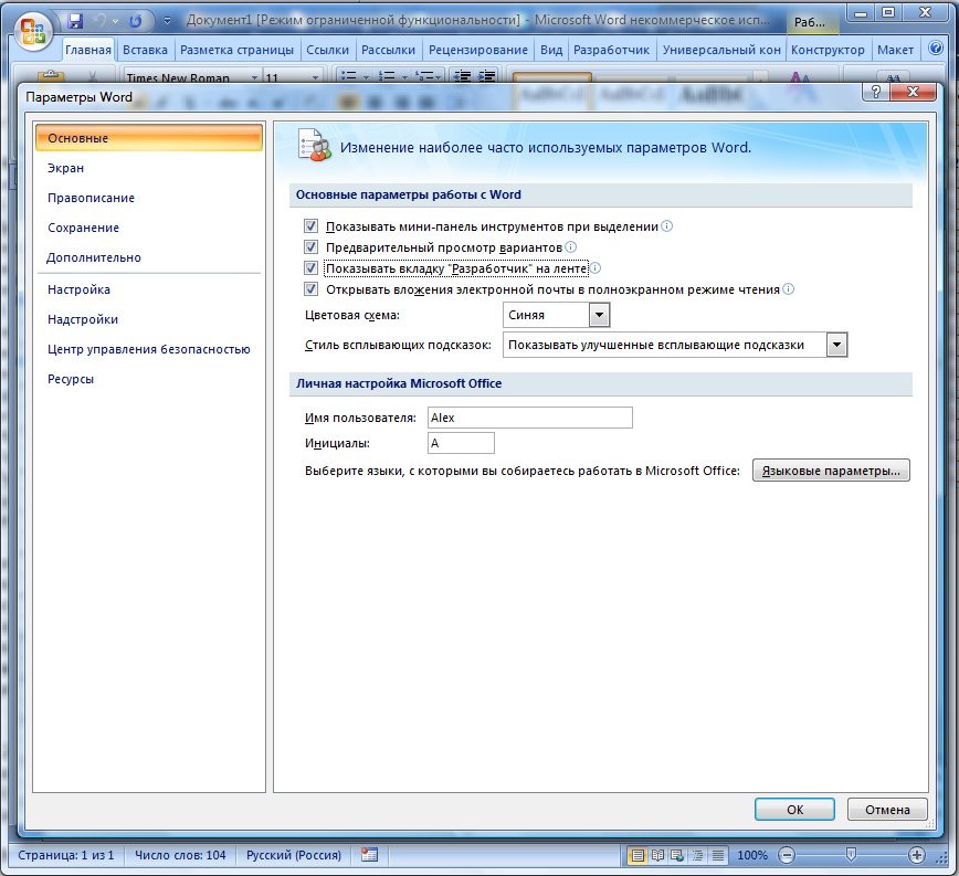 В разделе "Основные" поставьте галочку "Показывать вкладку Разработчик на ленте", затем нажмите ОК.