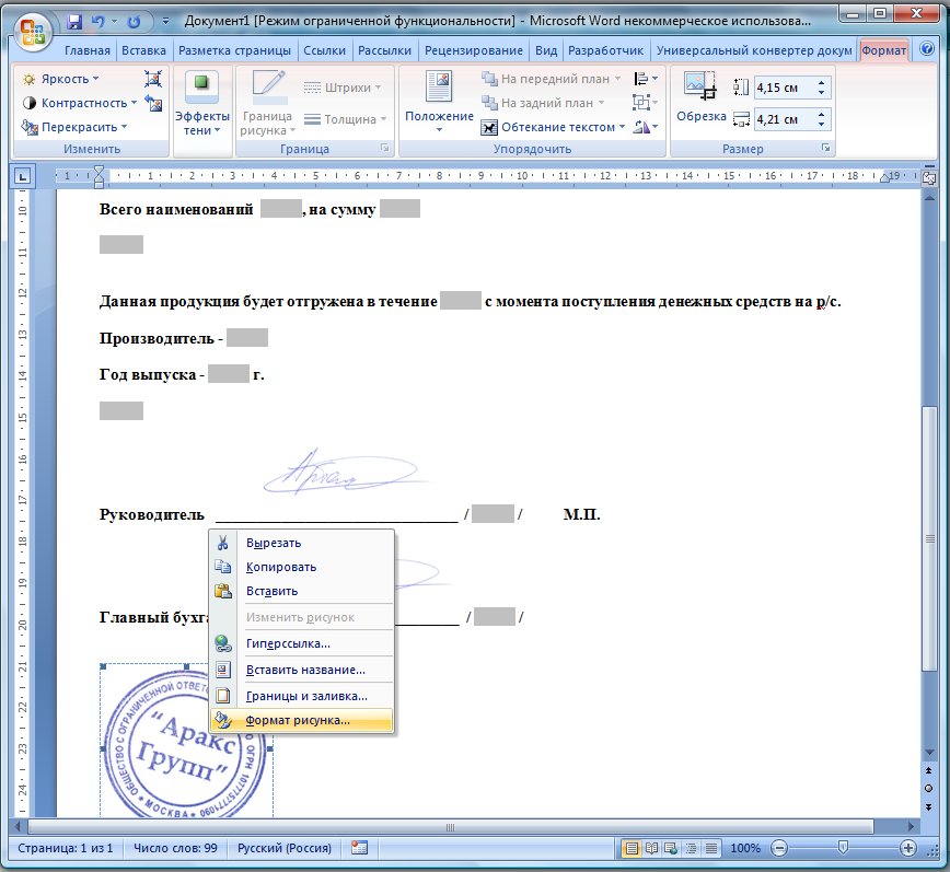 Правой кнопкой мыши щелкните по изображению печати и выберите пункт контекстного меню "Формат рисунка".