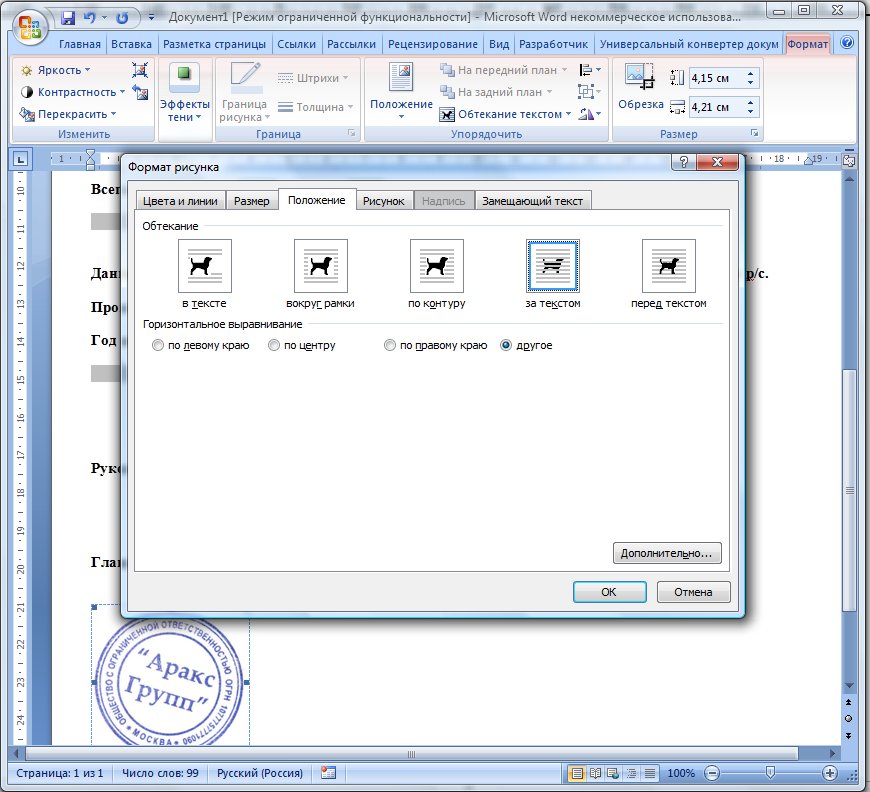 После настройки положения изображения нажмите ОК, окно "Формат рисунка закроется".