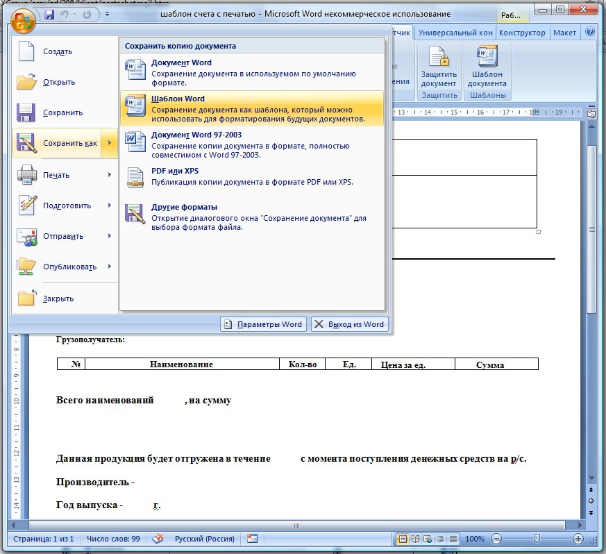 Для формирования счета в PDF в версии MS Office 2007 должен быть установлен компонент Надстройка 2007 Microsoft Office: сохранение в формате PDF или XPS (Майкрософт), который можно скачать на сайте поддержки компании Microsoft по адресу https://www.microsoft.com/ru-ru/download/details.aspx?id=7.