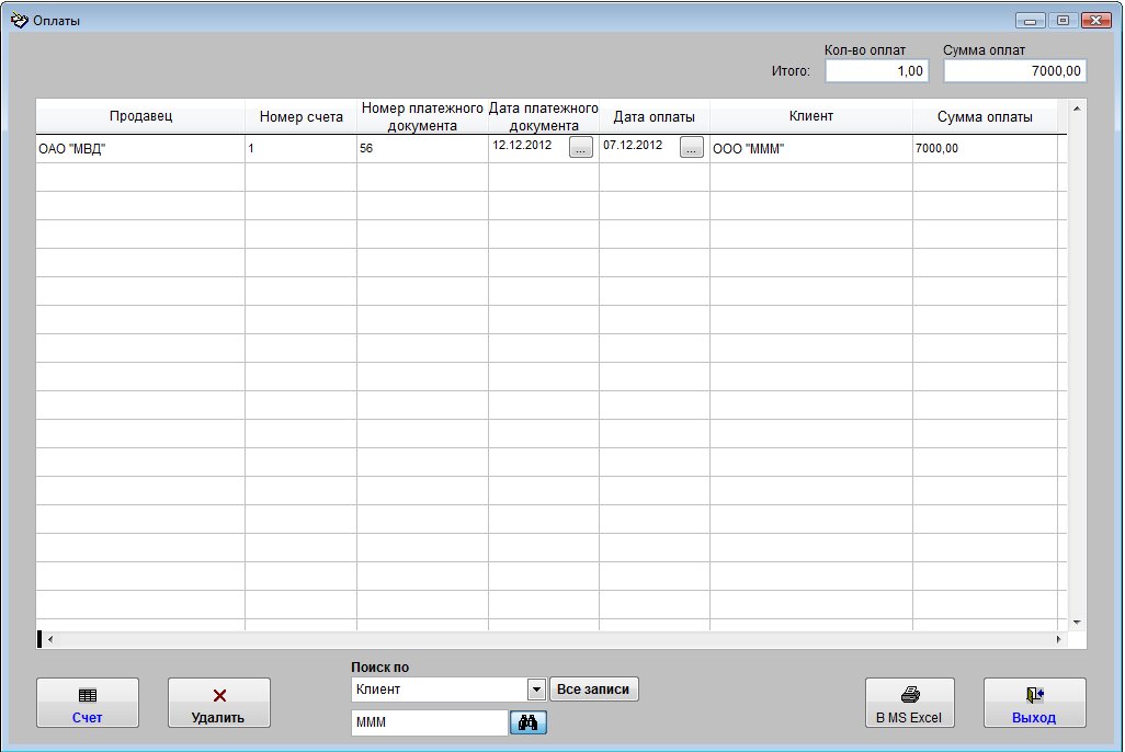 В верхней части формы над таблицей отобразится количество найденных оплат и их общая сумма.