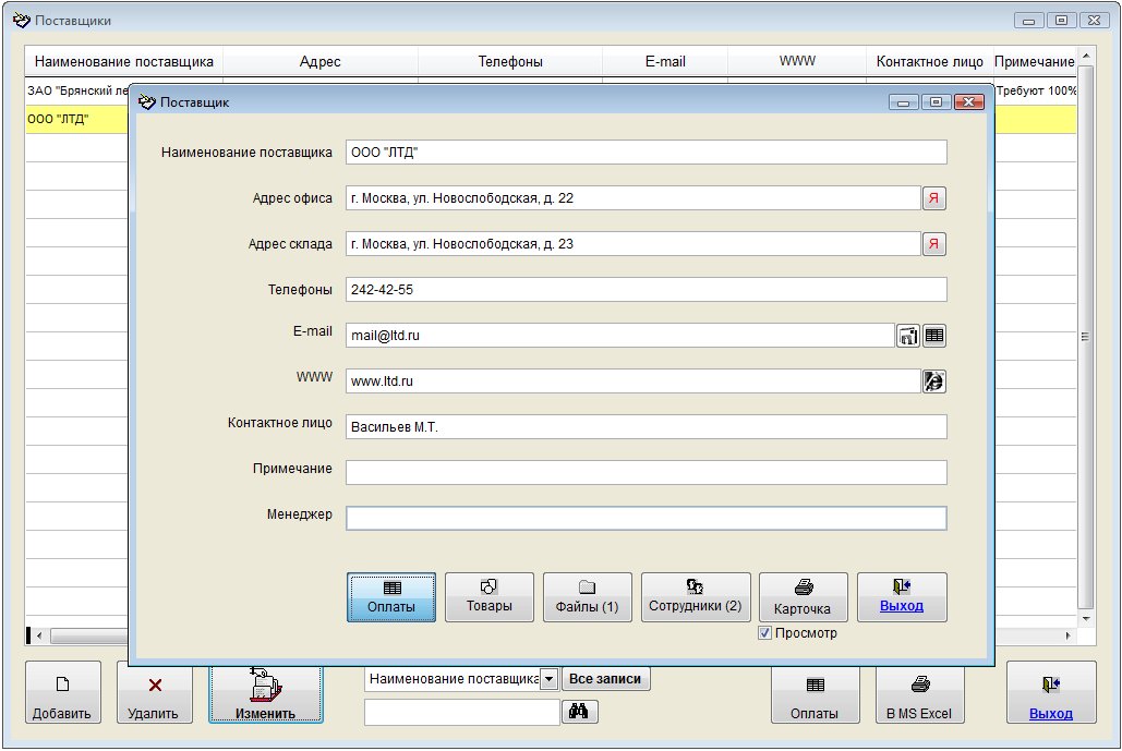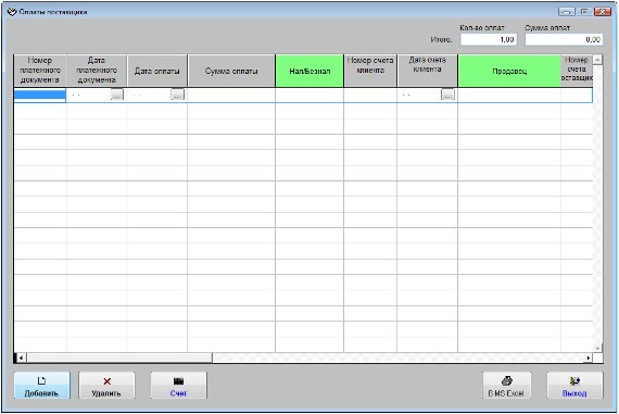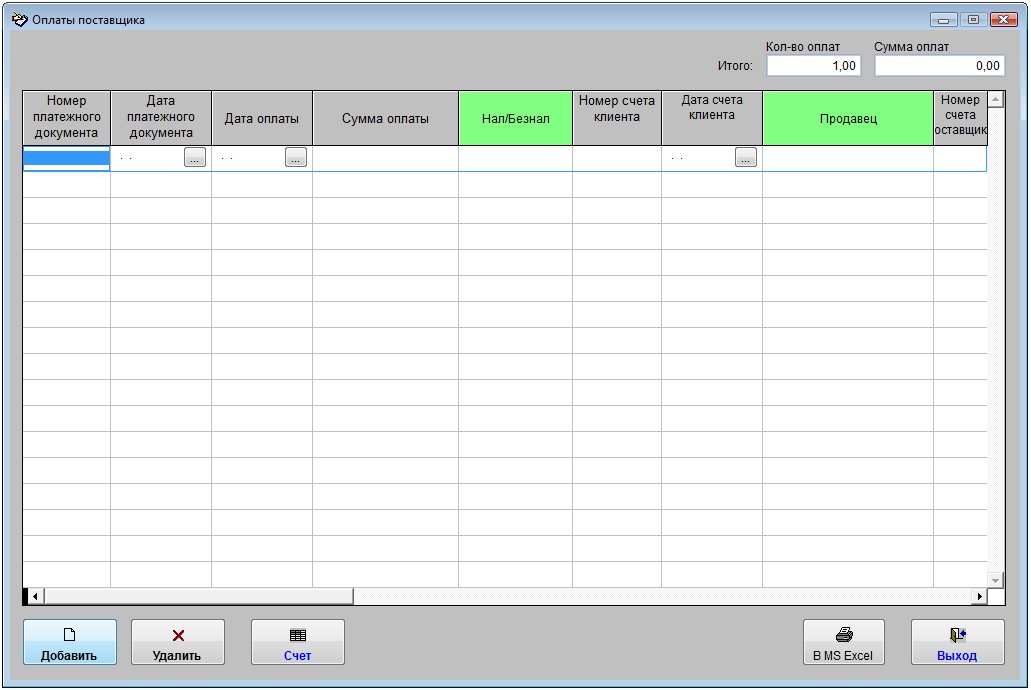 Для введения информации об оплатах поставщику в карточке поставщика нажмите кнопку "Оплаты".