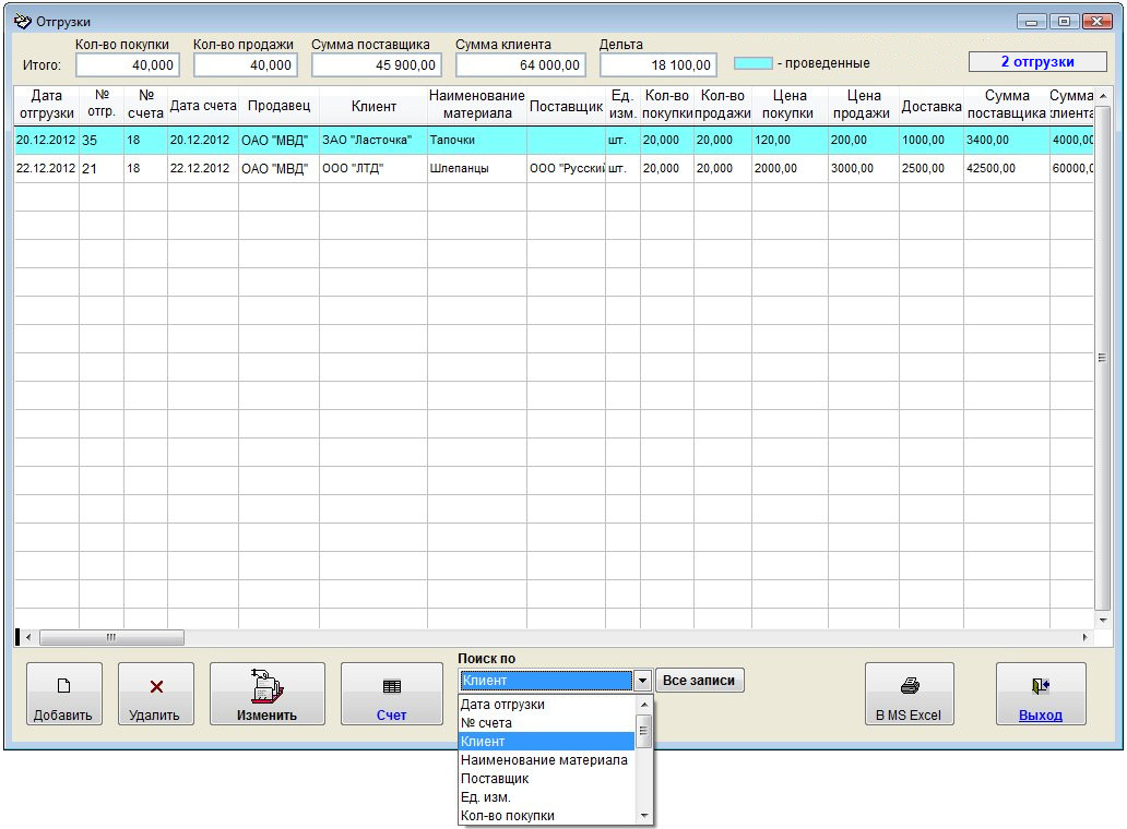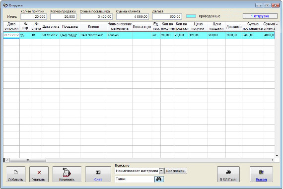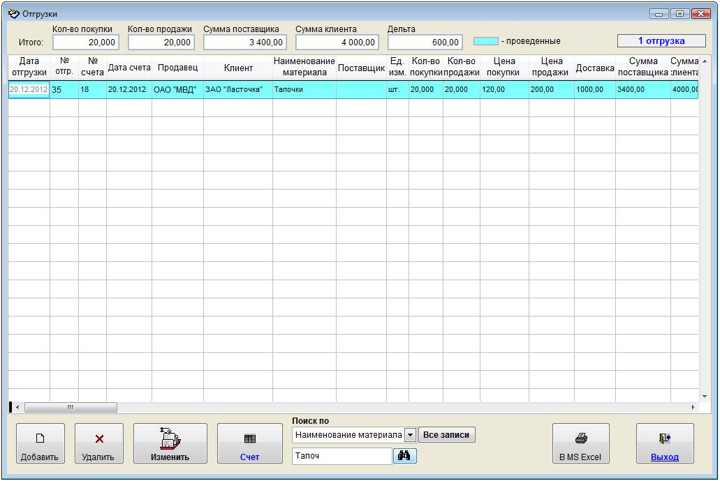 В журнале отобразятся отгрузки, соответствующие критерию поиска, в нашем случае у котрых товар содержит введенный в поле поиска текст.
