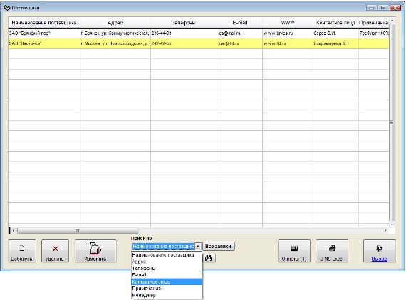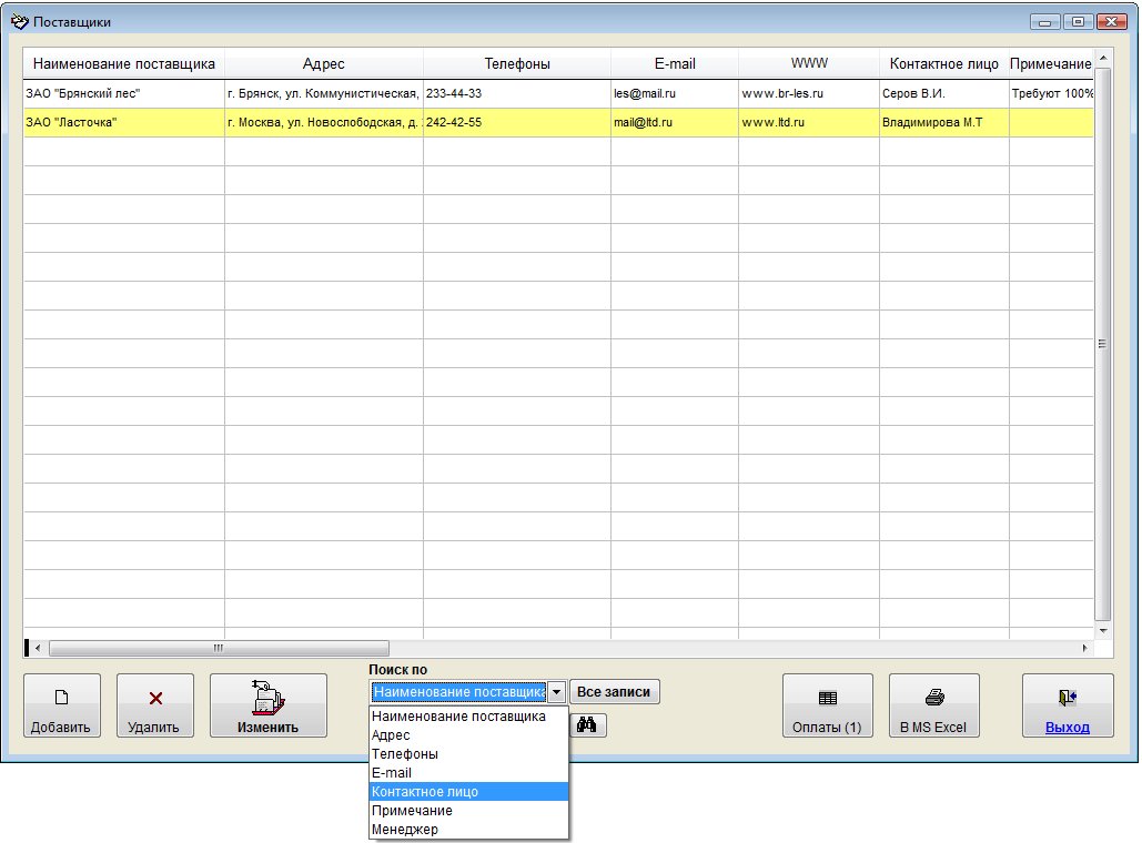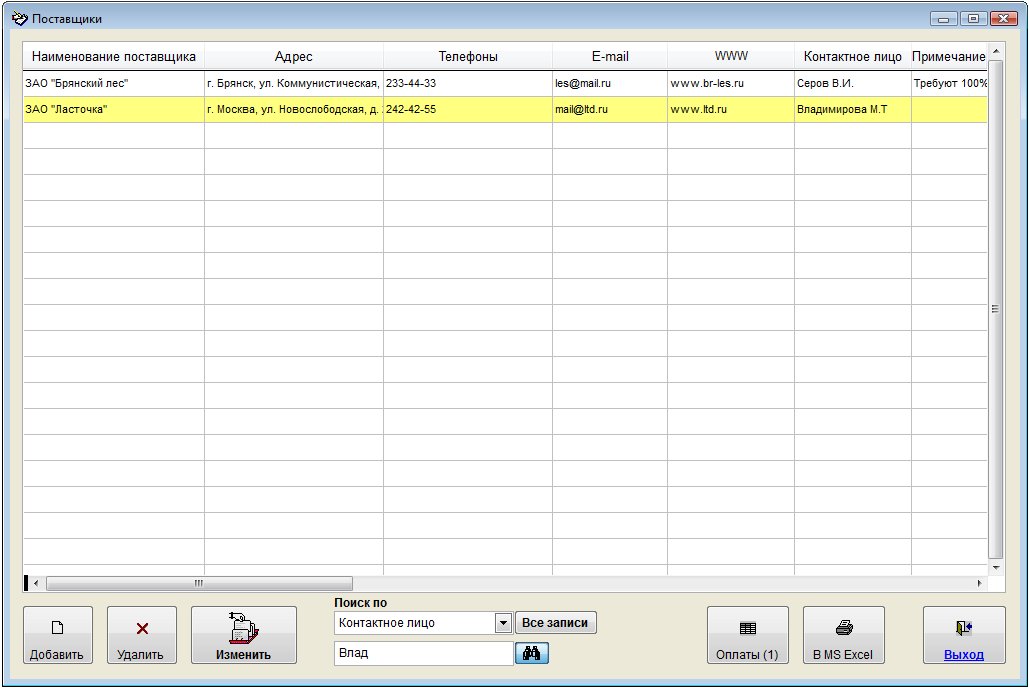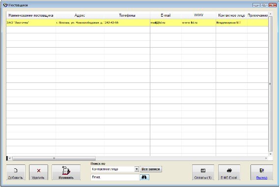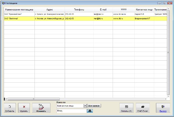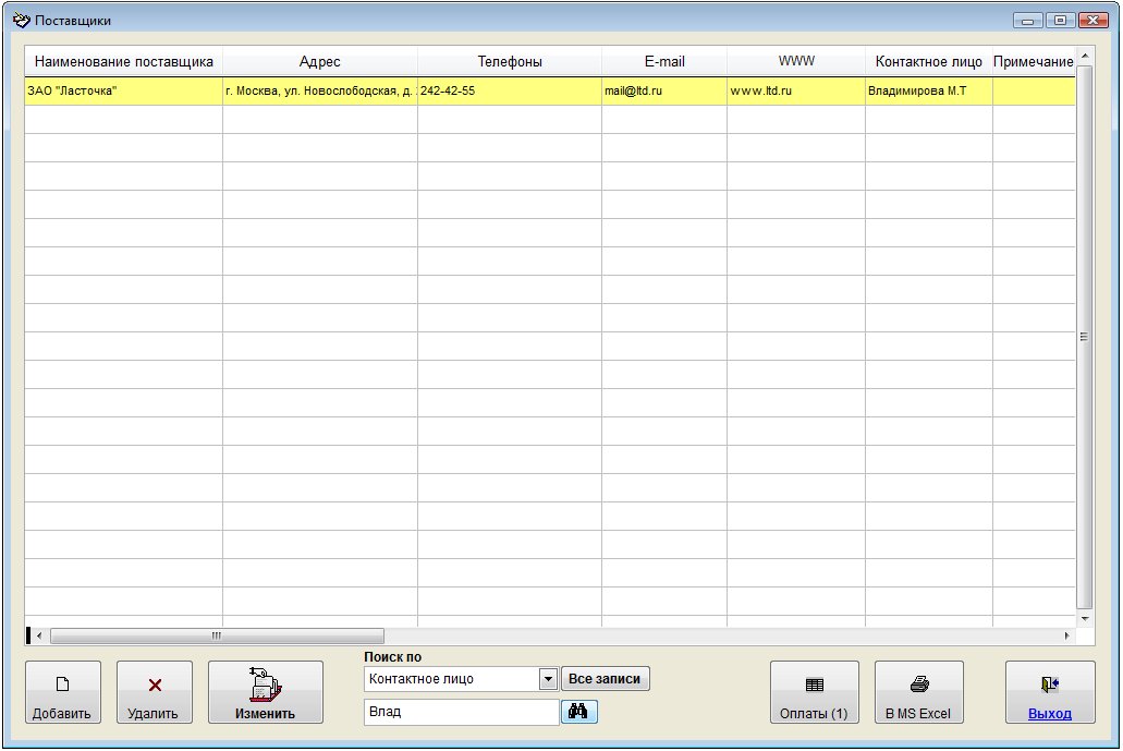 В журнале поставщиков отобразятся только те записи, которые соответствуют критерию поиска, т.е. у которых в поле Контактное лица содержится введенный в поле поиска текст.