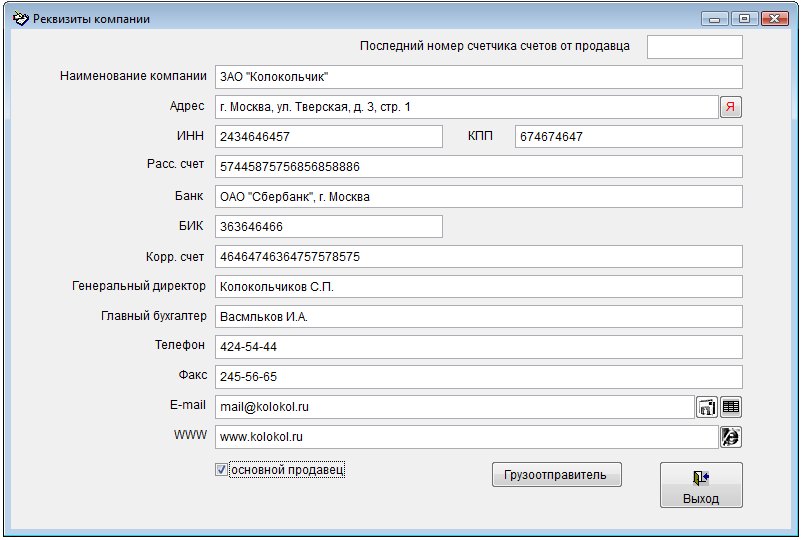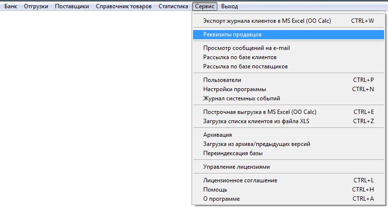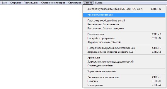 Для ввода реквизитов продавца выберите пункт меню Сервис-Реквизиты продавцов.
