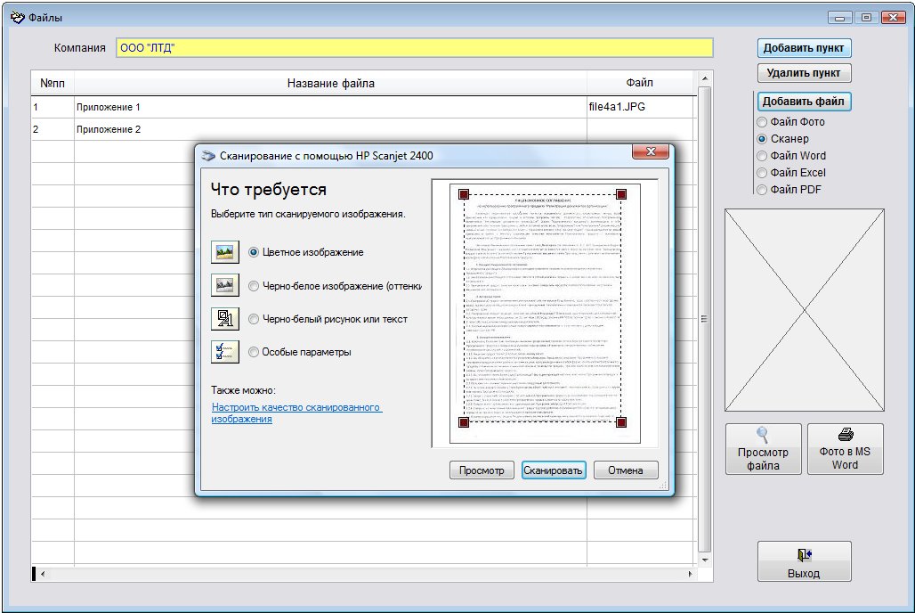 Для получения изображения сразу со сканера добавьте пункт, затем установите опцию "Сканер" и нажмите кнопку "Добавить файл".