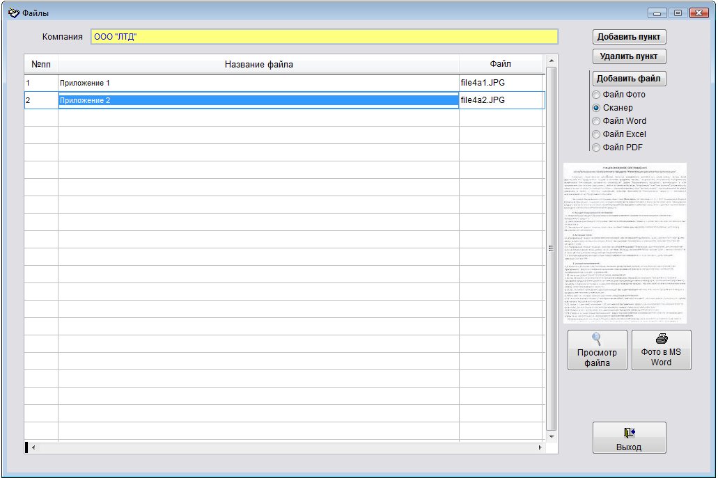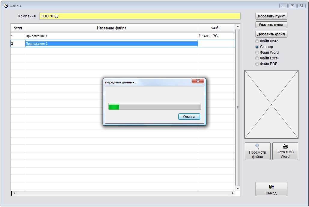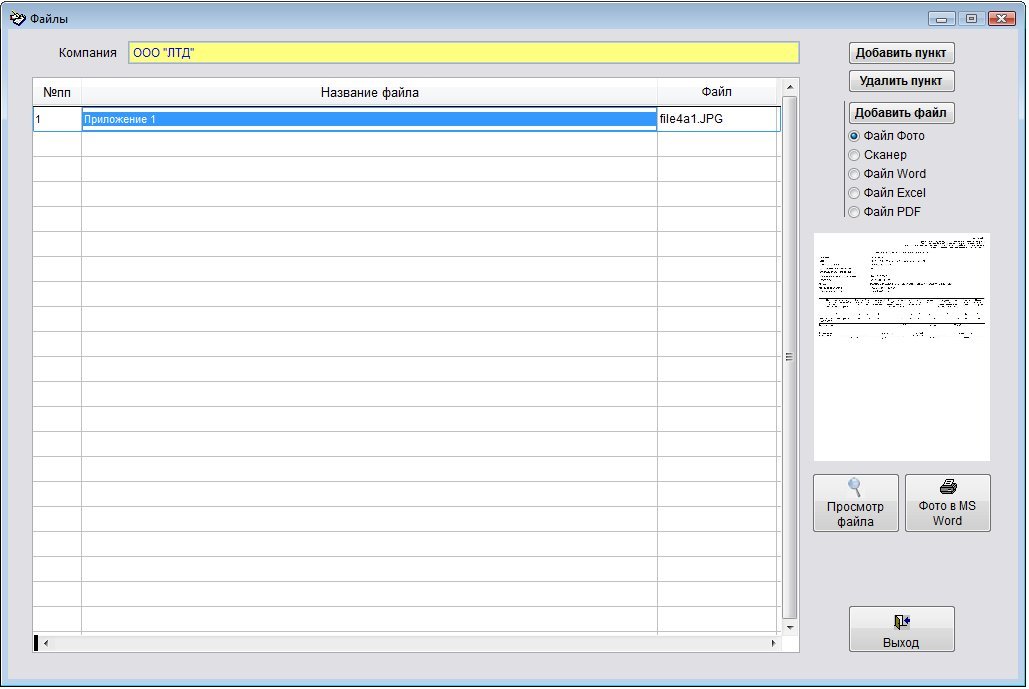 Для прикрепления ранее отсканированного графического файла с диска выберите опцию "Файл Фото" и нажмите кнопку "Добавить файл".