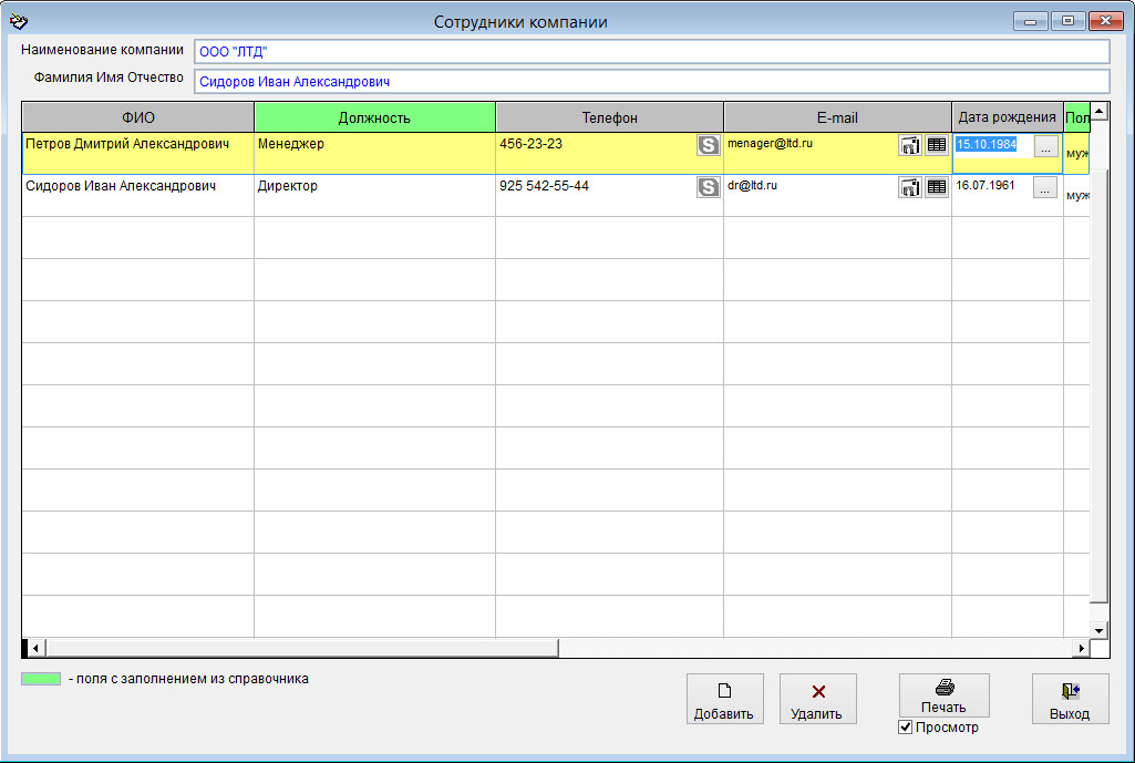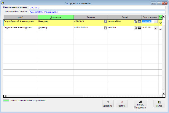 Сведения о сотруднике клиента и дата рождения вносятся в закладке Сотрудники в карточке клиента.