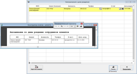 В напоминание попадут сотрудники клиентов (либо клиенты), у которых до дня рождения осталось менее, чем количество дней, указанное в настройках в меню Сервис-Настройки программы в разделе "Напоминание по дням рождения".