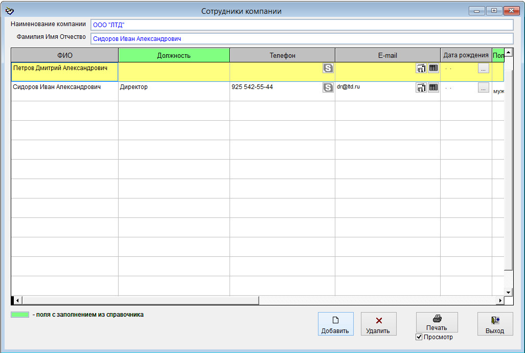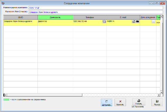 Для печати списка сотрудников данного поставщика нажмите кнопку "Печать" с изображением принтера.