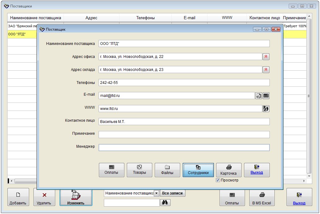Для введения информации о сотрудниках поставщика в карточке поставщика нажмите кнопку "Сотрудники".