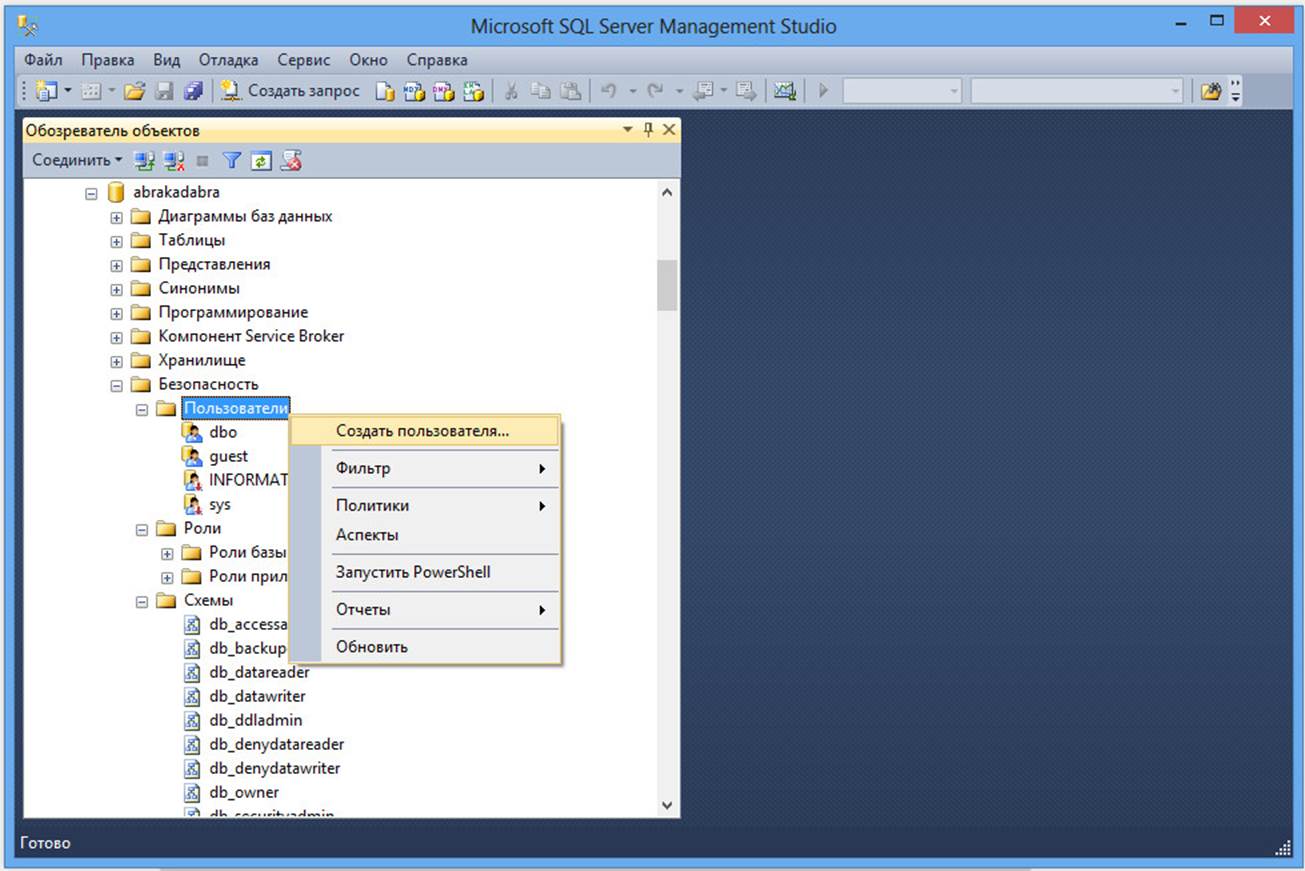 Для добавления пользователя раскройте базу данных – раскройте раздел Безопасность-Пользователи-Правая кнопка мыши-Создать пользователя.