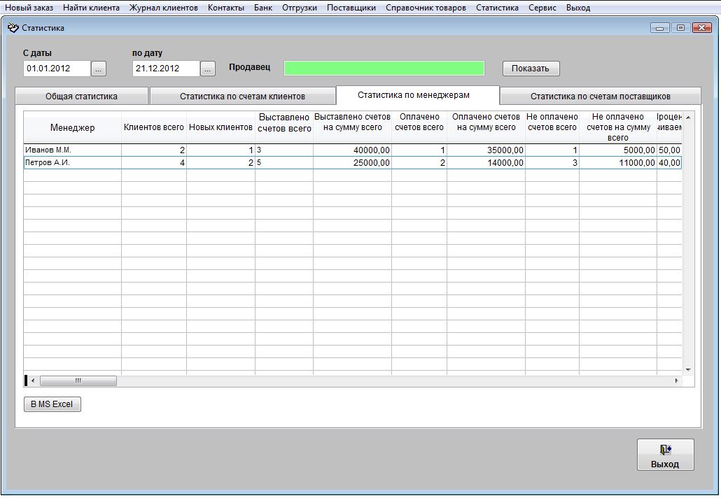 Для формирования статистики по клиентам, заказам, оплатам и отгрузкам менеджеров выберите пункт меню "Статистика".