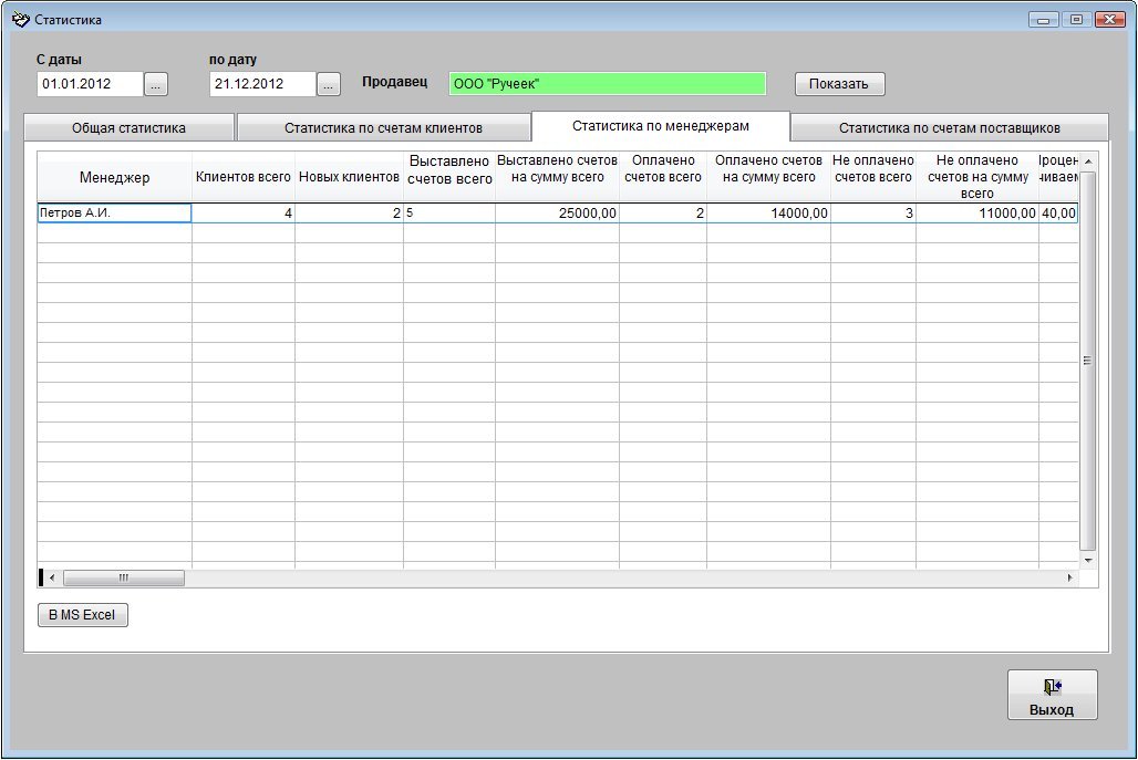 В программе есть возможность формирования подробной статистики по счетам, оплатам, отгрузкам, как общей, так и в разрезе клиентов, менеджеров или поставщиков.