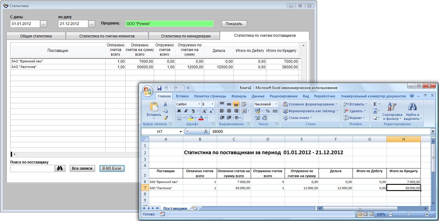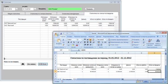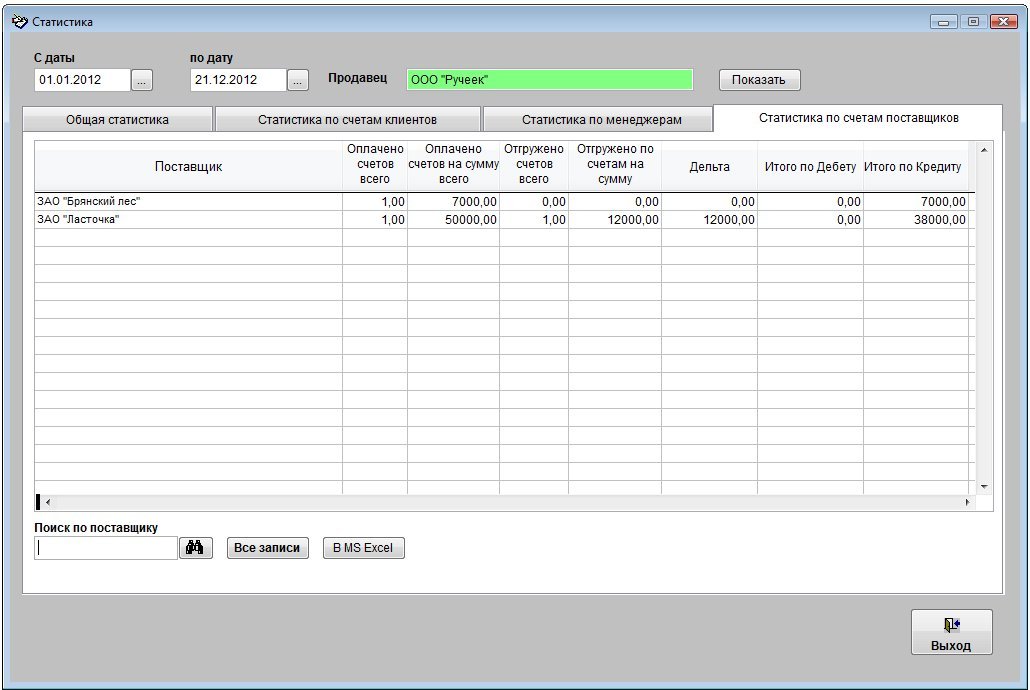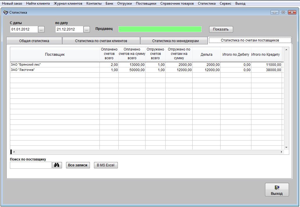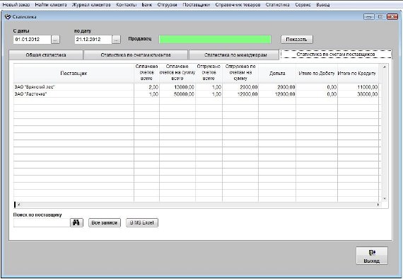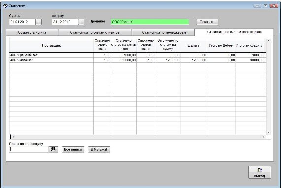 В программе есть возможность формирования подробной статистики по счетам, оплатам, отгрузкам, как общей, так и в разрезе клиентов, менеджеров или поставщиков.