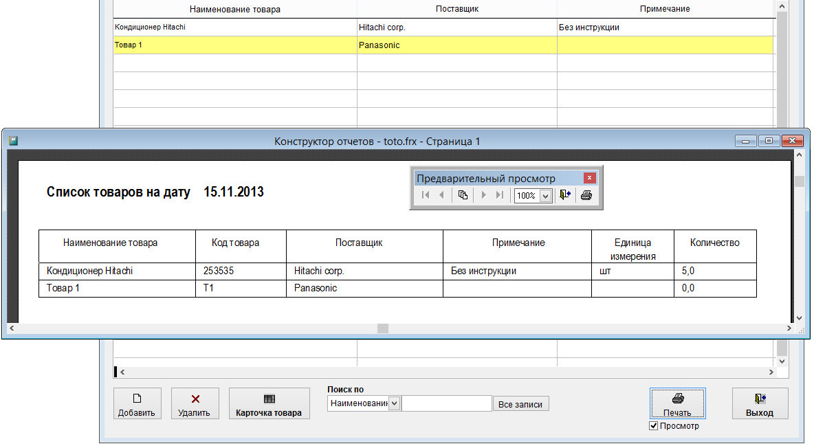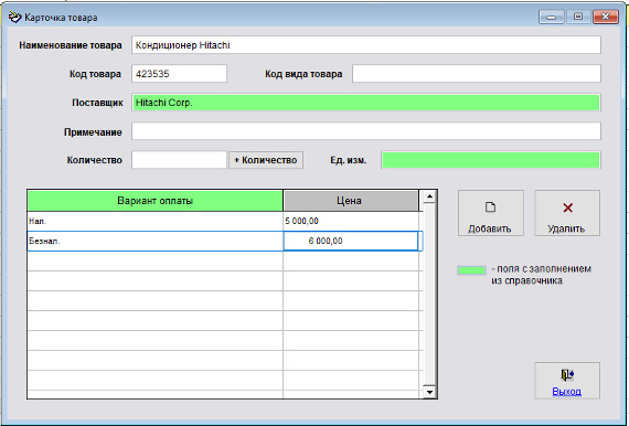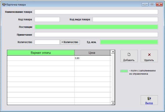 Заполните название товара, код товара, введите поставщика, количество товара на складе.