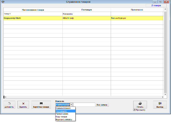 Для поиска товара в справочнике выберите параметр поиска и введите текст для поиска в поле Поиск.