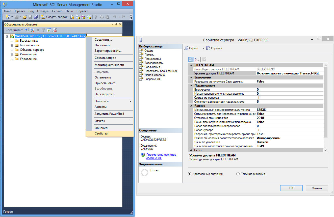 В диалоговом окне Свойства SQL Server перейдите на вкладку FILESTREAM.