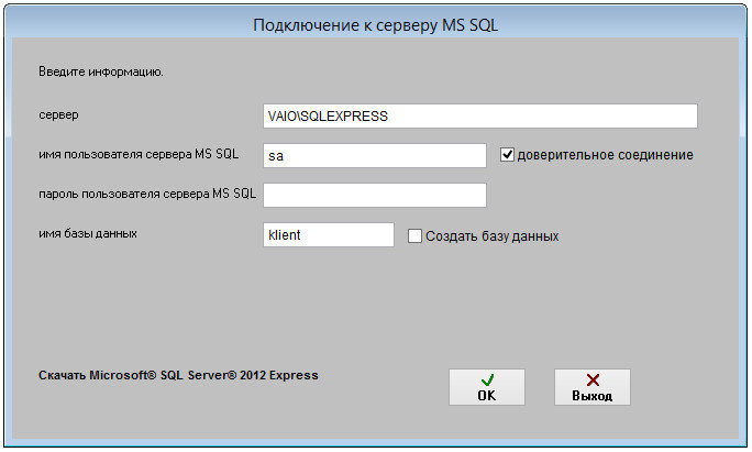 Скачать Microsoft® SQL Server® 2012 Express можно по адресу https://www.microsoft.com/ru-RU/download/details.aspx?id=29062