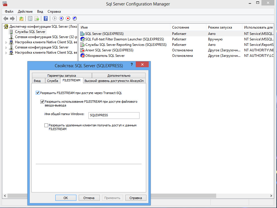 В оснастке Диспетчер конфигурации SQL Server найдите экземпляр SQL Server, в котором нужно включить FILESTREAM.