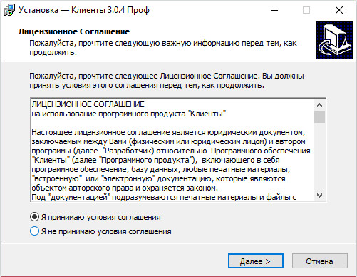 Затем появится лицензионное соглашение. Установите параметр "Я принимаю условия лицензионного соглашения" и нажмите кнопку "Далее".