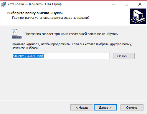 Выберите программную группу, куда программа инсталляции скопирует ярлык для программы. По умолчанию для каждой программы группа своя. Затем нажмите кнопку "Далее"