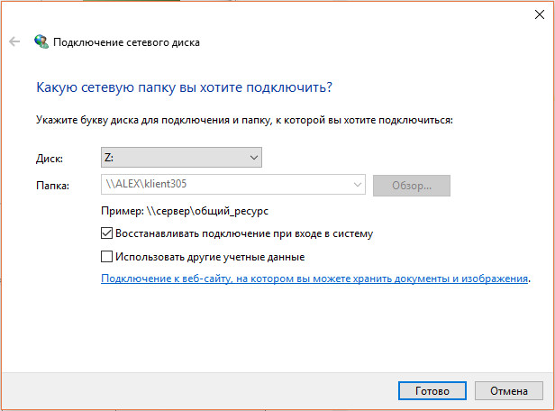 Имя диска выбирается любое из доступных, например Z, затем нажмите кнопку "Готово".